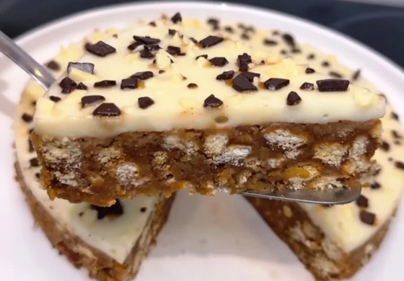 Залишаємо пиріг у холодильнику на 4 години, а потім знімаємо кондитерську форму та подаємо до столу.