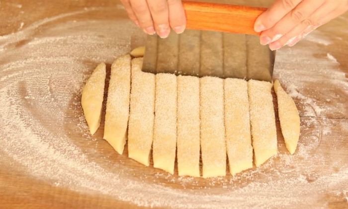 Посипаємо тісто цукром і розрізаємо пласт на невеликі квадратики.