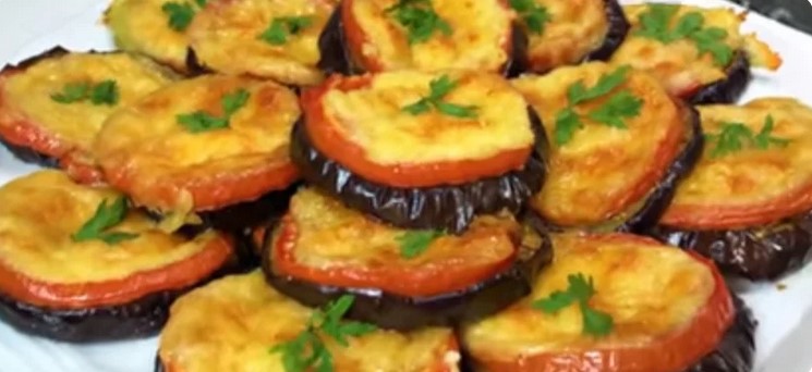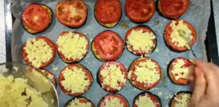 Витягуємо баклажани з духовки, зверху на кожен шматочок баклажана викладаємо кружок помідора.