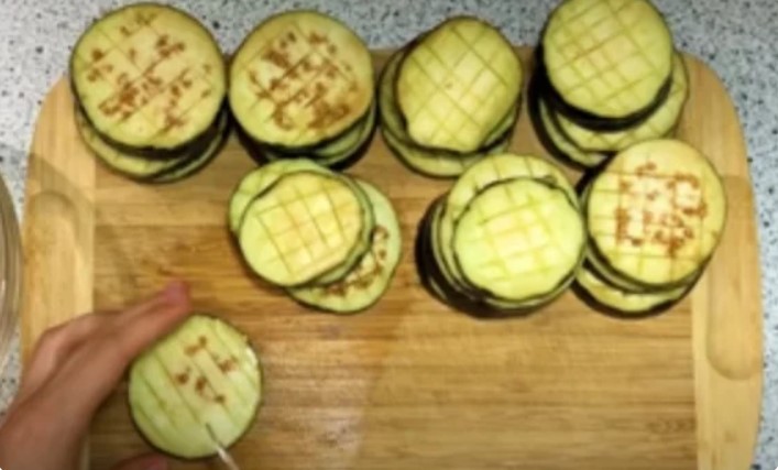 На баклажанах нарізаємо ножем сіточку.