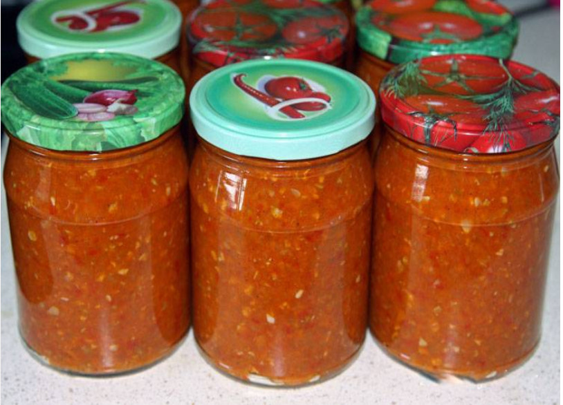 Розкладаємо нашу аджику в стерилізовані баночки, накриваємо стерилізованими кришками і герметично закручуємо. Наша аджика готова. Смачного!