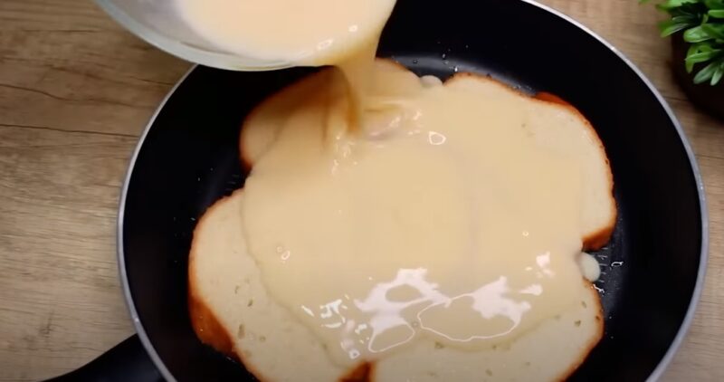 Занурюємо скибочки хліба в яєчну суміш, а потім перекладаємо на гарячу сковороду. Сумішю, що залишилася, заливаємо хліб, смажимо страву 5 хвилин на середньому вогні.