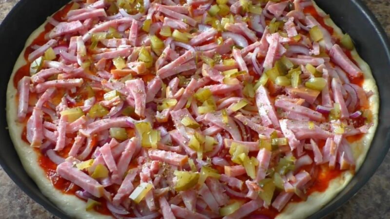 Замішуємо руками тісто і залишаємо на 30 хвилин у теплі під рушником. Нарізаємо маленьким кубиком шинку, мариновані огірки та сир. Ріжемо тонкими півкільцями цибулю.