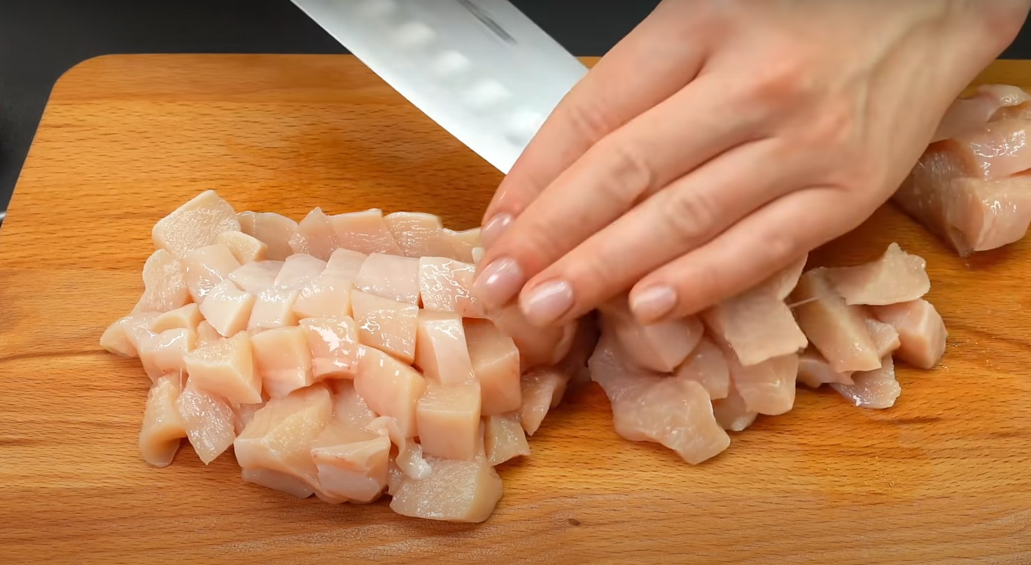 Нарізаємо невеликими кубиками філе куряче, солимо.