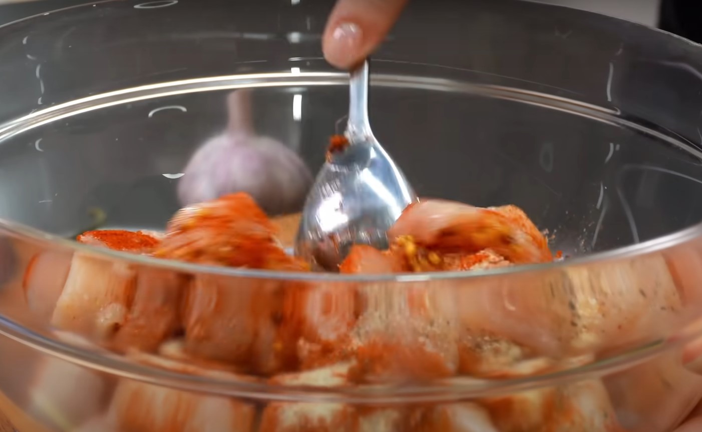 Висипаємо до філе часниковий порошок, паприку, чорний перець та французьку гірчицю, змішуємо.