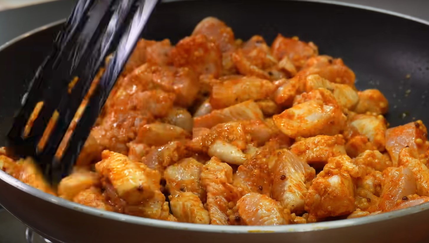 Нарізаємо маленьким кубиком цибулю. У сковороді на оливковій олії обсмажуємо до м’якості цибулю. Забираємо м’яку цибулю з вогню, оновлюємо олію та обсмажуємо курячі шматочки.