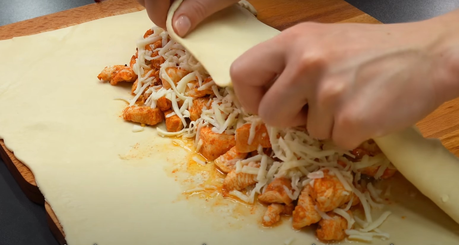 Уздовж на середину пласта викладаємо м’яку злегка обсмажену цибулю. Натираємо на маленьких різцях терки сир, посипаємо цибулю. На цибульну подушку кладемо обсмажене куряче м’ясо, покриваємо сиром.
