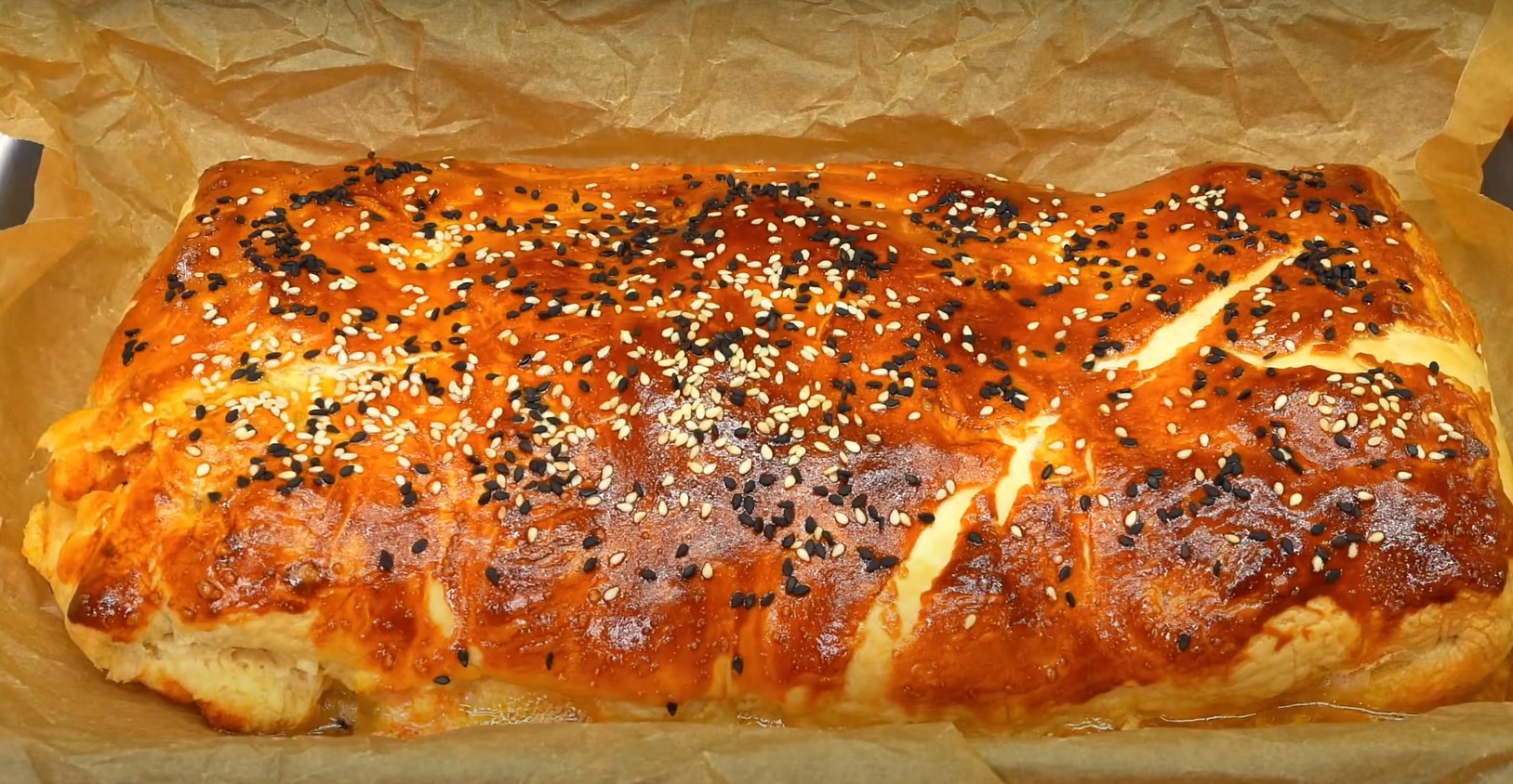 Попередньо тісто можна посипати кунжутом. Відмінно поєднується страва з простим салатом з помідорів, огірків та цибулі.