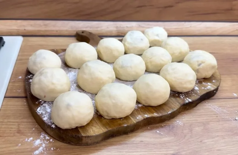 Замішуємо еластичне та м’яке тісто, залишаємо його у теплі під целофаном на 20 хвилин. Обминаємо тісто, ділимо навпіл.