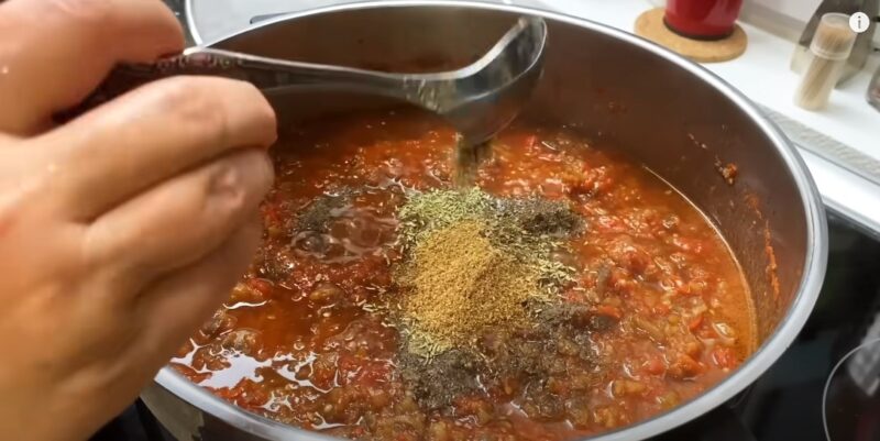 Додаємо до овочевої маси сіль та цукровий пісок, перемішуємо та варимо 20 хвилин під кришкою на повільному вогні. Висипаємо в соус коріандр, розмарин, базилік та чорний мелений перець, змішуємо компоненти.