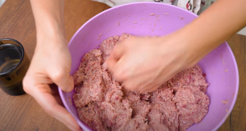 Холодну воду вливаємо при необхідності: якщо маса у вас рідка, тоді не варто додавати воду. Краще добре відбити фарш і відправити його в холодильник на кілька годин. Якщо фарш дуже щільний, тоді поступово вливаємо воду та вимішуємо. Відправляємо в холодильник на 3-4 години.