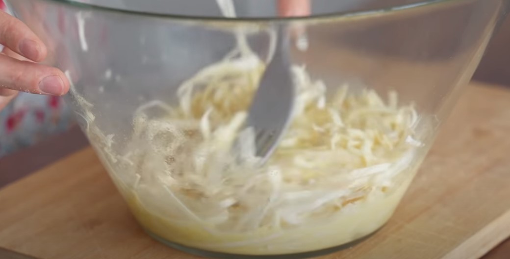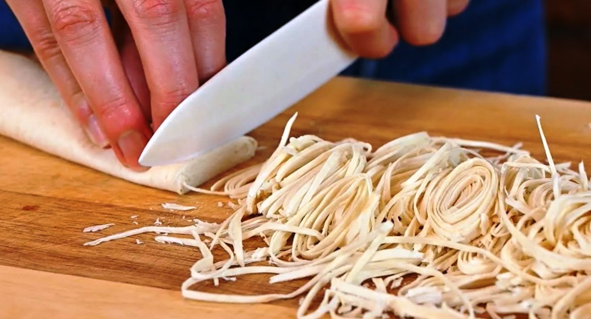 Лаваш згортаємо трубочкою і ріжемо тонкою соломкою.