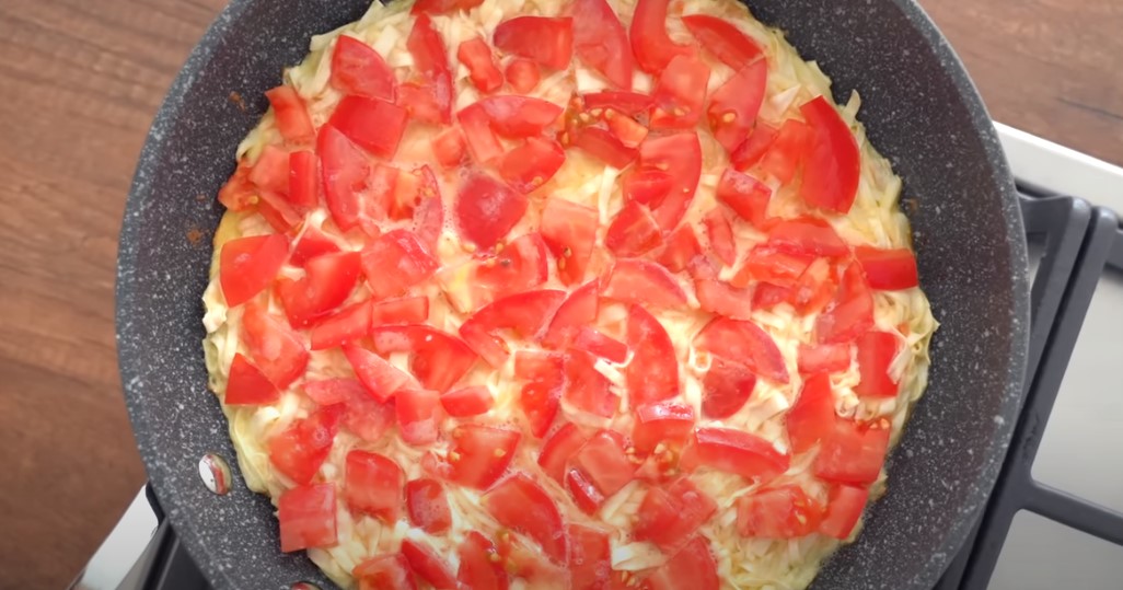 Лаваш викладаємо на сковороду рівним шаром, посипаємо сиром та рубаною зеленню, кладемо помідор.
