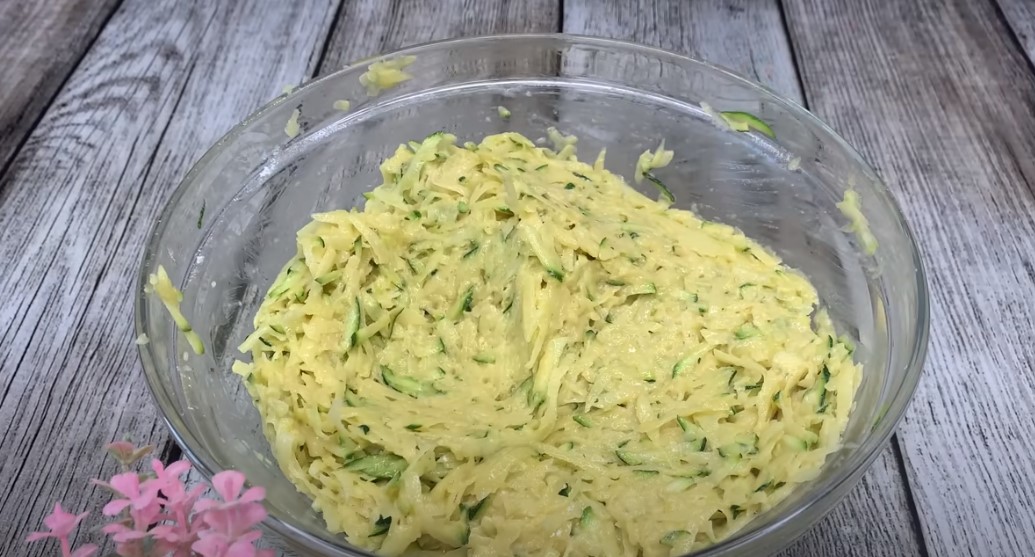 Натираємо картоплю і кабачки на великій тертці, солимо, залишаємо на пару хвилин і потім віджимаємо від соку, що скупчився.