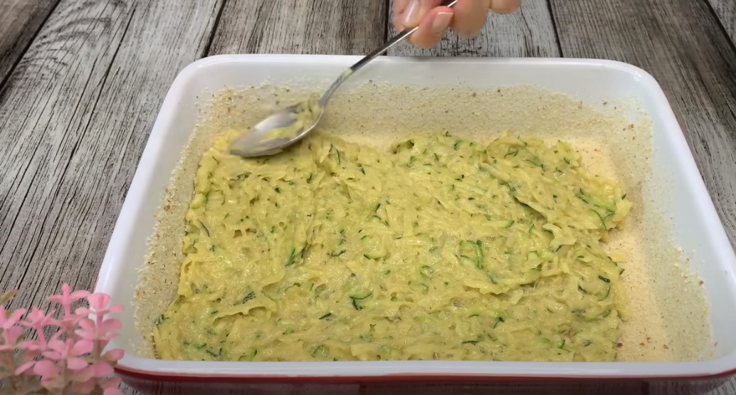 Викладаємо рівним шаром частину овочевої маси.