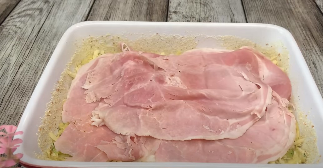 Посипаємо тертим сиром і викладаємо скибочки шинки.
