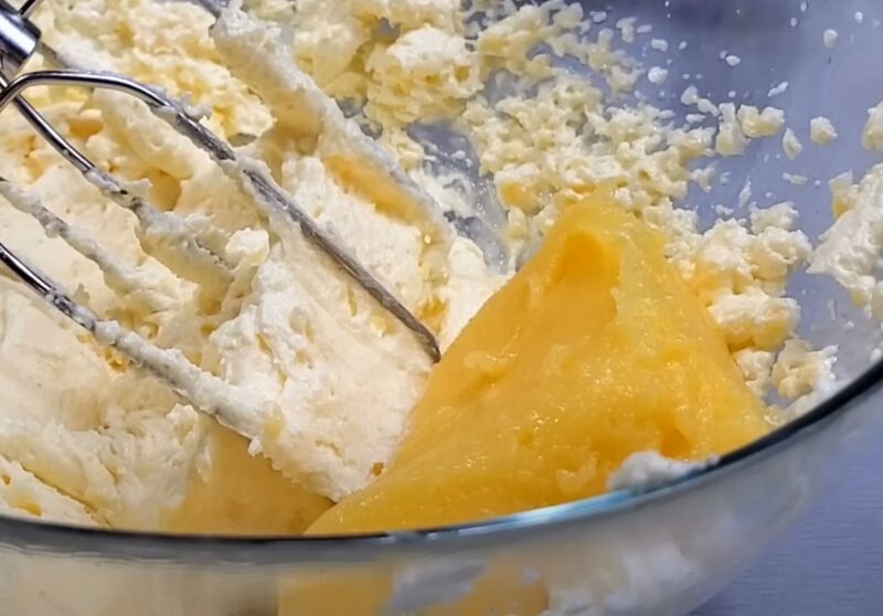 Для крему збиваємо до побіління вершкове масло, поступово додаємо до нього заварну основу.