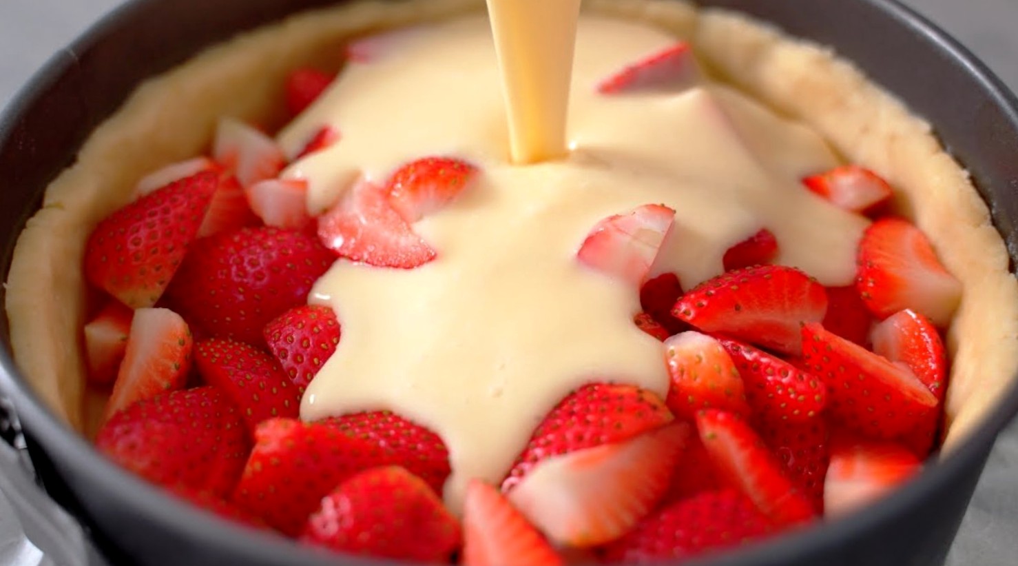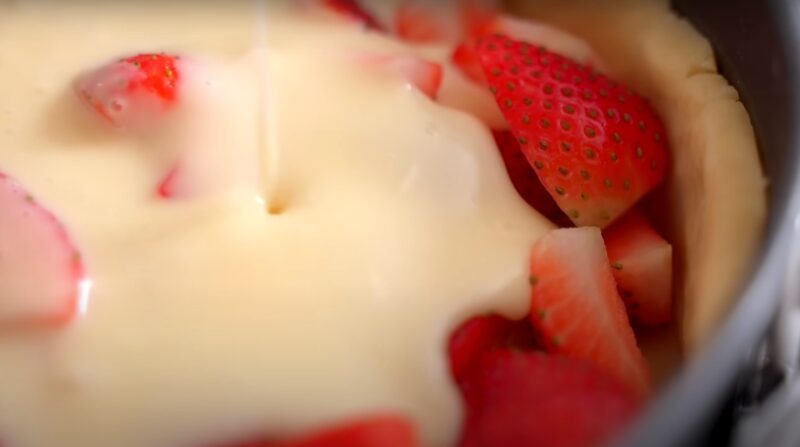 Викладаємо у форму із тіста полуницю, заливаємо сметанним кремом.