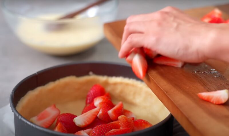Нарізаємо полуницю невеликими четвертинками. У форму для випікання діаметром 22 см викладаємо холодне тісто. Формуємо дно та бортики висотою 3-4 см.