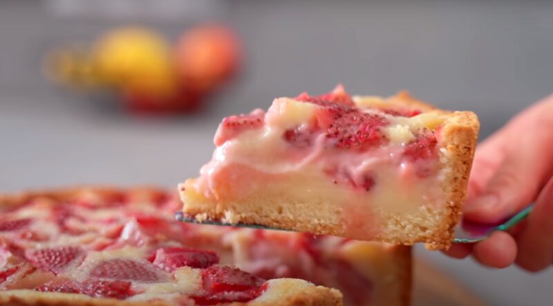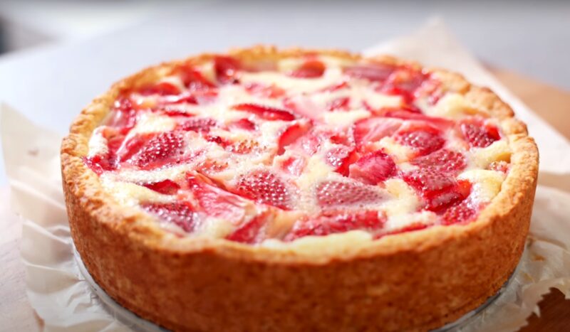 За 10-20 хвилин до закінчення випікання рекомендується накрити пиріг фольгою, щоб він не отримав горілу скоринку. Виходить гарний пиріг із полуниці.