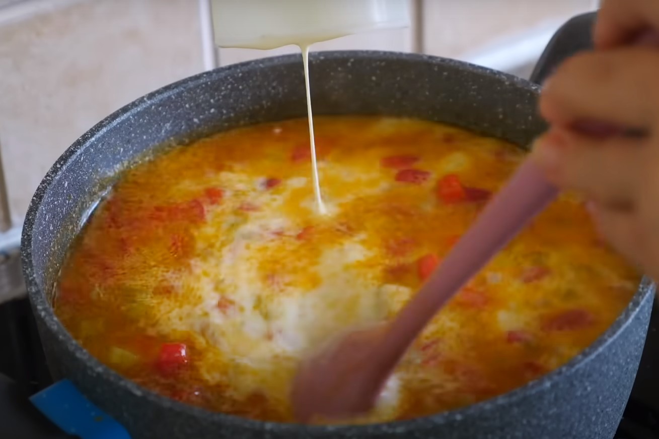 За хвилину до готовності макаронів вливаємо вершки, перемішуємо і продовжуємо варити суп.