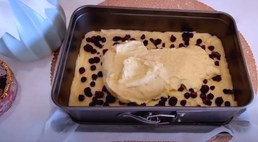 Форму застеляємо пергаментом і викладаємо частину тіста, рівним шаром викладаємо ягоди і викладаємо другу частину тіста, розрівнюємо.
