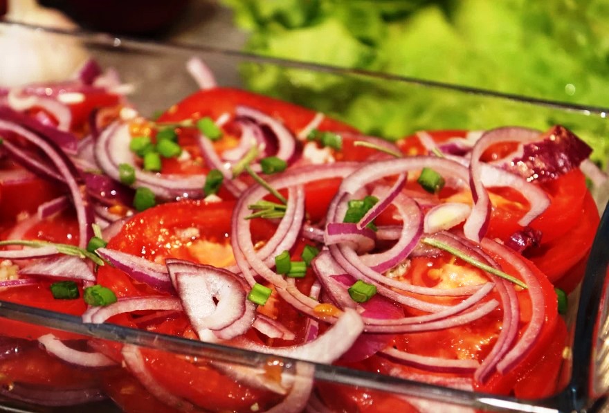 Мариновані помідори з цибулею та зеленню давно стали найулюбленішою сезонною закускою до шашликів, вони завжди присутні на святковому столі та на звичайній вечері.