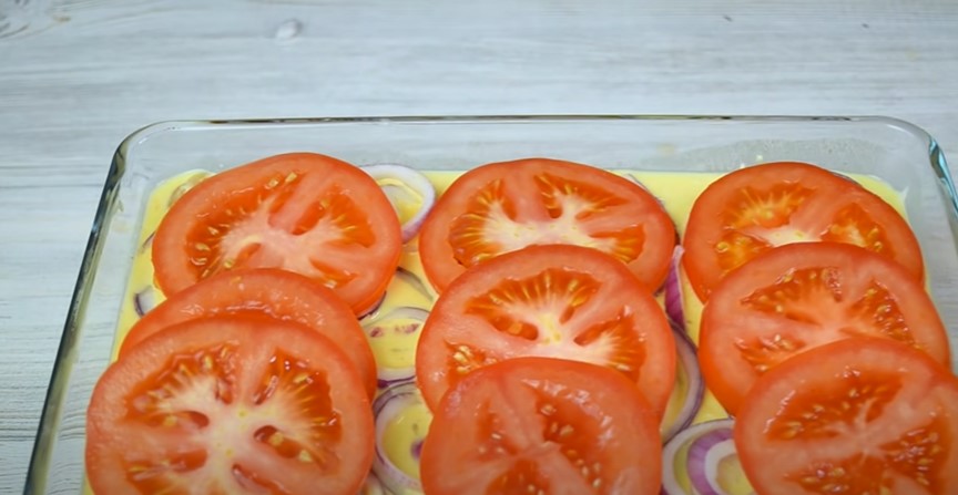 У форму для запікання викладаємо масу, зверху кладемо кружечки цибулі і помідорів.