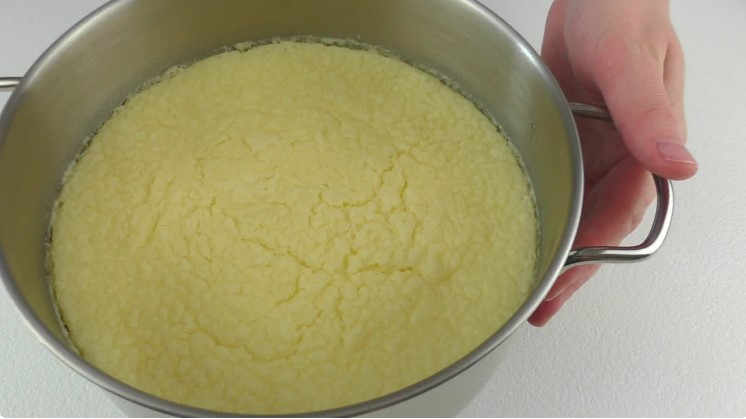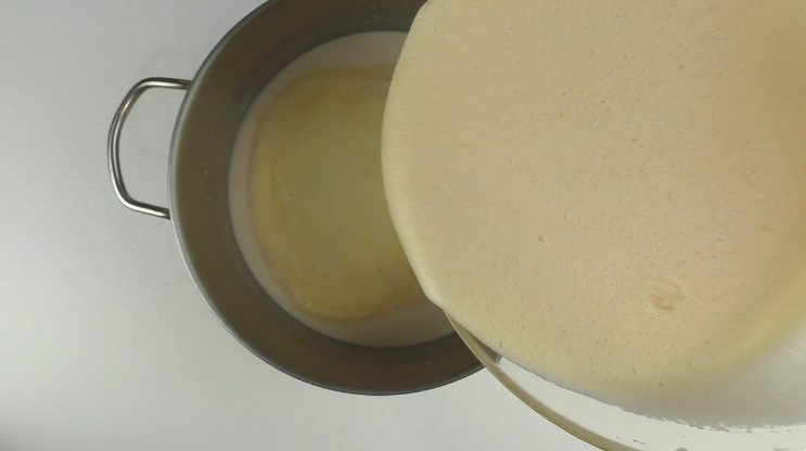 В іншу велику ємність (у мене каструля 3х літрів) вливаю тепле молоко (жирність можна взяти будь-яку) і додаю до нього дріжджі.