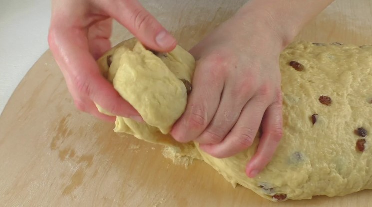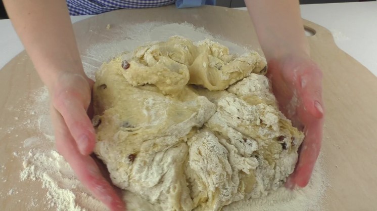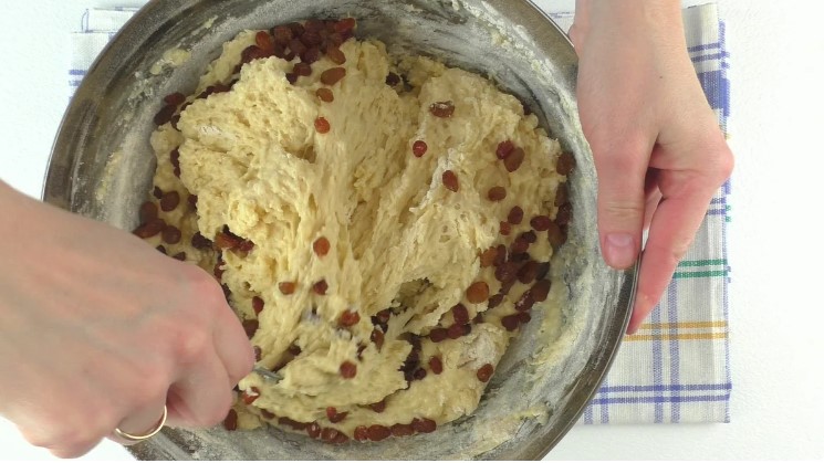 Коли всі інгредієнти додані і перемішувати ложкою вже складно, перекладаю тісто на стіл, трохи присипаний борошном. І продовжую його замішувати і обминати вже на столі. Під час замішування ізюм повністю з’єднується з тістом, а саме тісто стає однорідним і м’яким.