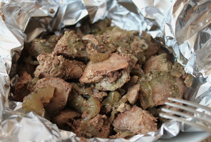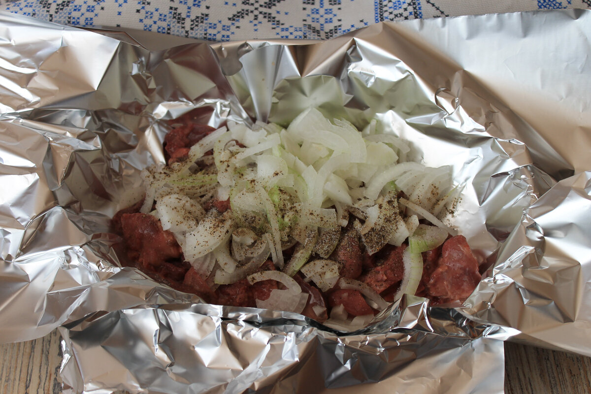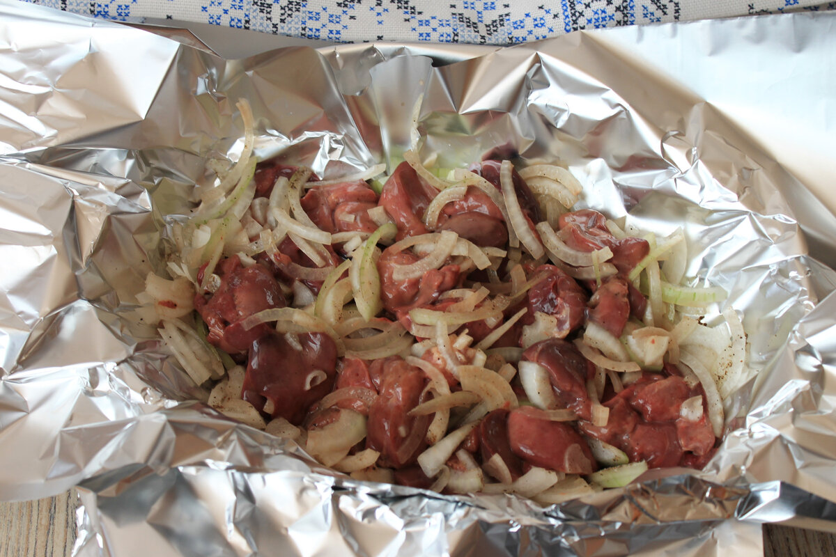 Тепер беремо якусь невелику форму для випічки, усередину застилаємо фольгу, формуючи форму чаші та закладаємо в неї печінку. Додаємо цибулю, нарізану півкільцями, солимо, перчимо, злегка перемішуємо – в процесі запікання сіль все одно рівномірно розподілитися. Краї фольги закриваємо та відправляємо в духовку, розігріту до 180 градусів. Залежно від того, яку печінку використовуватимете, залежатиме час приготування — 20-35 хвилин.