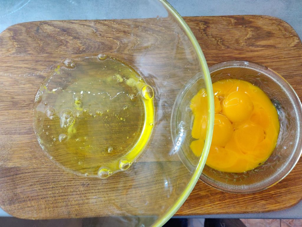 Спершу готуємо бісквітне тісто для основи рулета. Для цього розділяємо яйця на білки і жовтки.