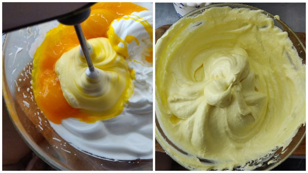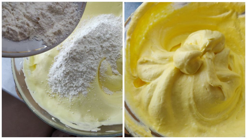 В окремому посуді змішуємо просіяне борошно з розпушувачем та у два підходи додаємо до яєчної маси, обережно перемішуємо з низу до гори.