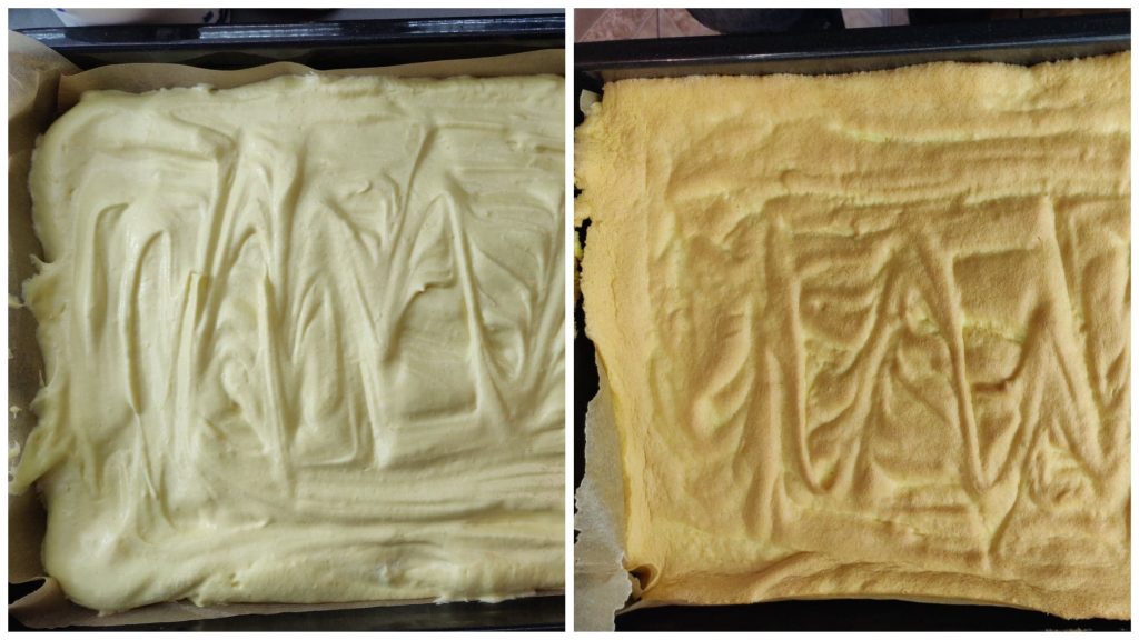 Форму застелаємо пергаментом, змащуємо олією і перекладаємо бісквітне тісто, розрівнюємо та кладемо у розігріту духовку до 180 С., на 15 хв.