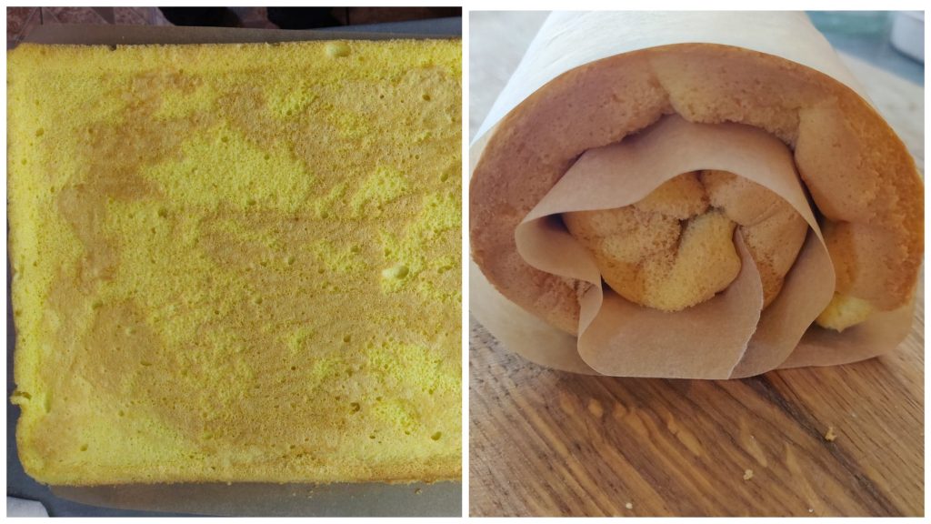 Нам залишилося розрівняти скручений рулет, розмащуємо крем і знову востаннє обережно скручуємо рулетом. Кладемо у холодильник на 3 години.