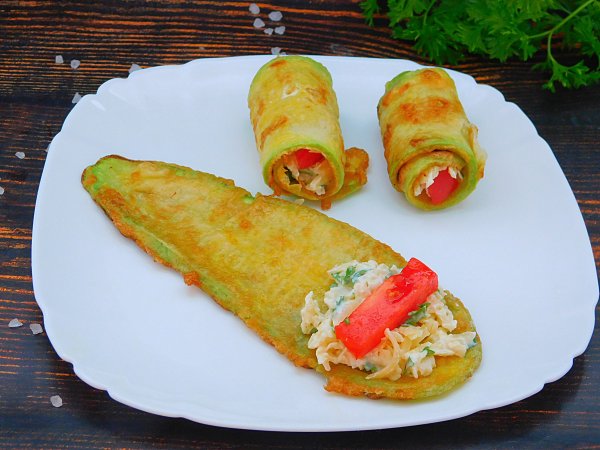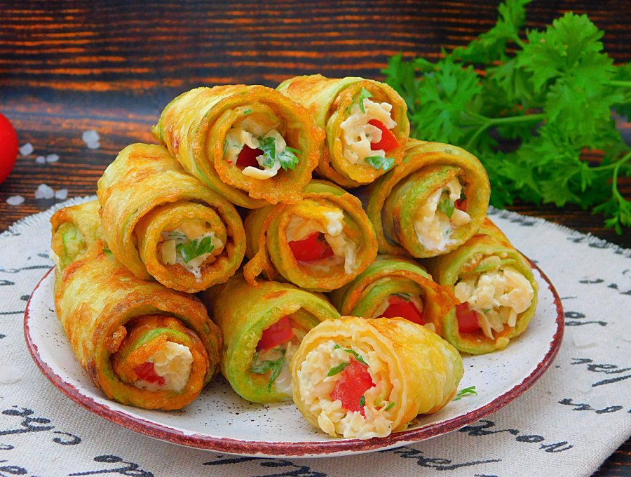Сьогодні на столі смачна сезонна закуска, готуємо рулетики з кабачків. Навіть з одного кабачка вийде досить багато. Смак трохи незвичайний за рахунок обсмажування кабачків в яєчному клярі. Обов’язково спробуйте.