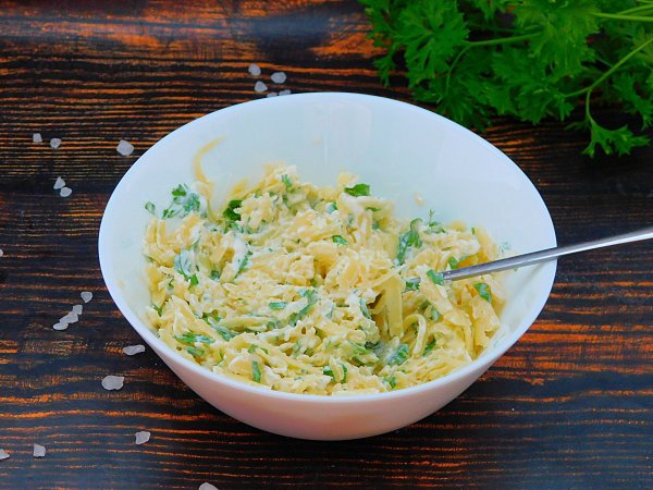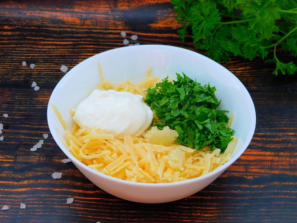 За цей час зробити начинку. У миску помістити натертий сир, сметану, подрібнені часник і зелень петрушки.