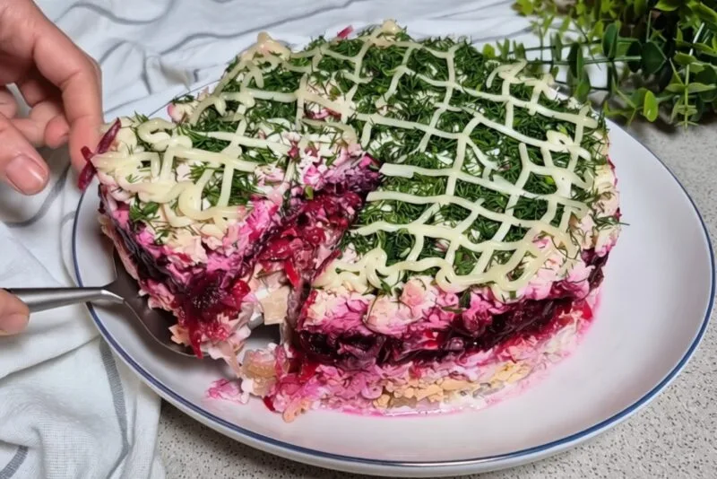 У салаті “Буряне диво” з’єднані базові інгредієнти. Копчена курка робить страву більш ситною, а яйця надають ніжної текстури. Мариновані огірки роблять страву більш солонуватою, плавлені сирки надають вершкового смаку.