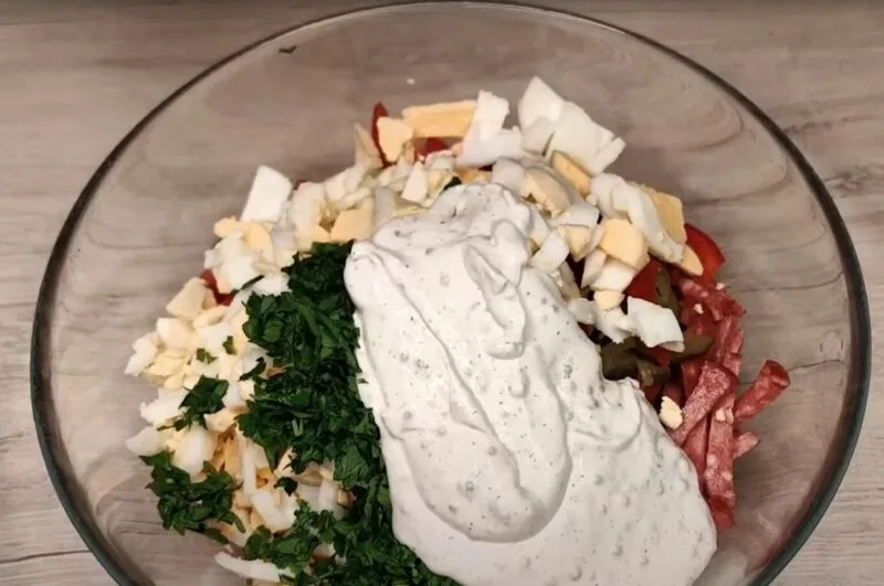 Салат із ковбаси, солоних огірків, солодкого перцю та яєць – це простий та поживний салат для повсякденного раціону. У даній страві поєднуються ковбаса, свіжі та мариновані овочі, а також заправка зі сметани з гірчицею та лимонним соком.