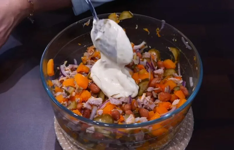Головне зробити для салату хорошу заправку. Найкраще використовувати домашній майонез зі спеціями. Так гарбуз та інші інгредієнти набудуть нових смакових відтінків.
