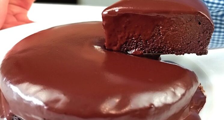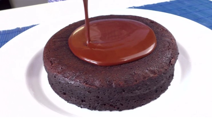 З його основи знімаю пергамент і тут же поверхню коржа акуратно поливаю ще гарячою шоколадною глазур’ю. Вона прекрасно розтікається, утворює красиві глянцеві “хвилі”.