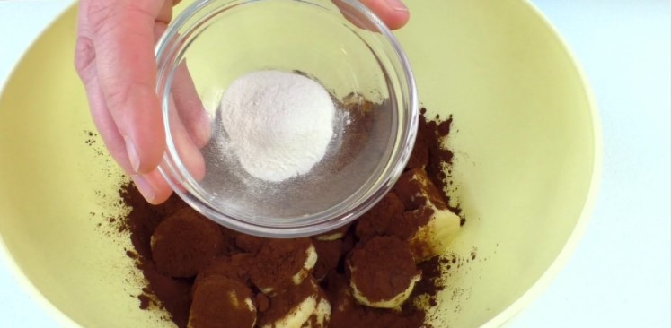 Підготовлені інгредієнти перекладаю в глибоку миску. Далі до них додаю 50 грам какао порошку, це 4 столові ложки. І сюди ж відправляю половину чайної ложки розпушувача.