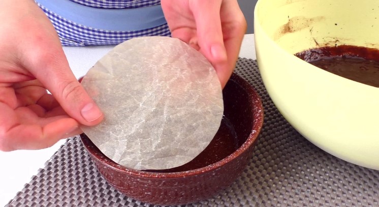 Вистелила дно пергаментом, щоб надалі легко перенести корж на тарілку, а боки трохи змастила соняшниковою олією.