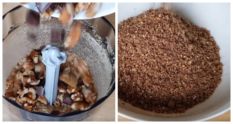 У подрібнені сухарі додаємо грецькі горіхи, шоколад і Нутеллу.