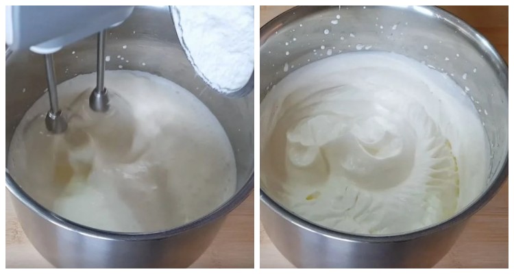 Коли вершки починають пінитися, поступово додаємо цукрову пудру.