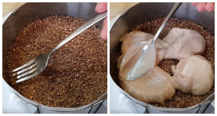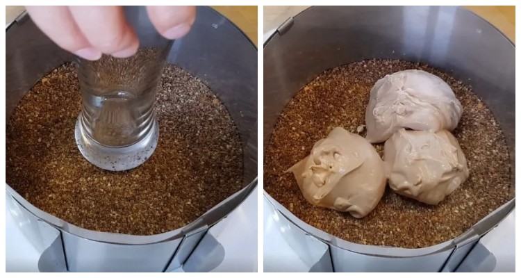 ¼ частину крихти висипаємо на тарілку, розрівнюємо і утрамбуємо склянкою. Утрамбовувати ми будемо тільки нижній шар.