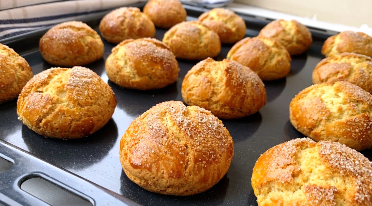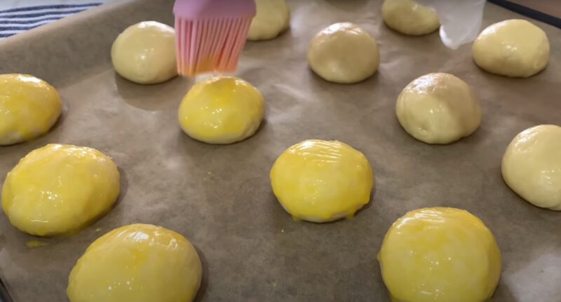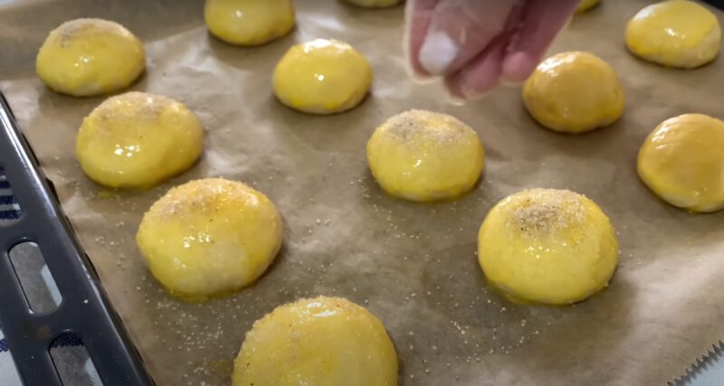 Застилаємо пергаментом деко, формуємо на поверхні маленькі колобки з тіста. Змішуємо жовток із молоком, змащуємо майбутнє печиво і посипаємо його цукром.