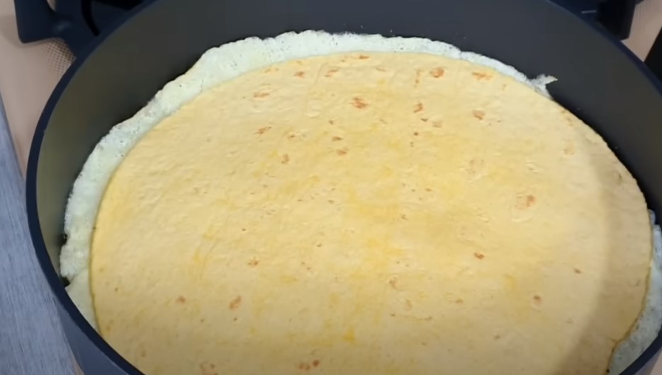 Викладаємо лаваш, смажимо кілька хвилин і перевертаємо на інший бік за допомогою тарілки чи кришки.