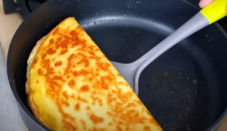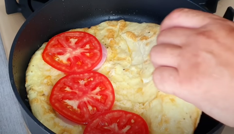 Розігріваємо сковороду з олією і виливаємо яєчну масу, трохи обсмажуємо низ, щоб верх схопився.