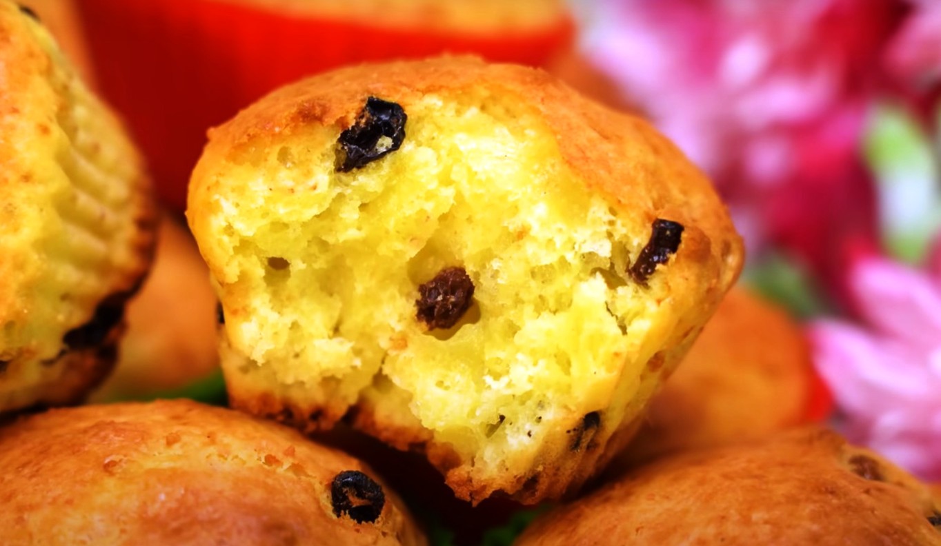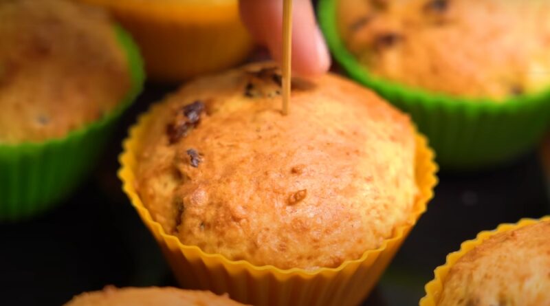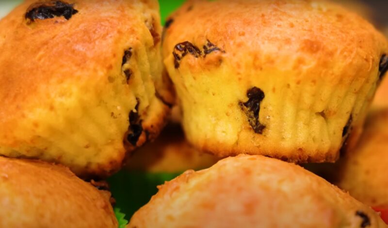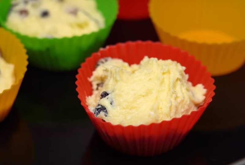 Промиваємо та висушуємо родзинки, додаємо в тісто і змішуємо. На ⅔ форм для кексів викладаємо тісто.